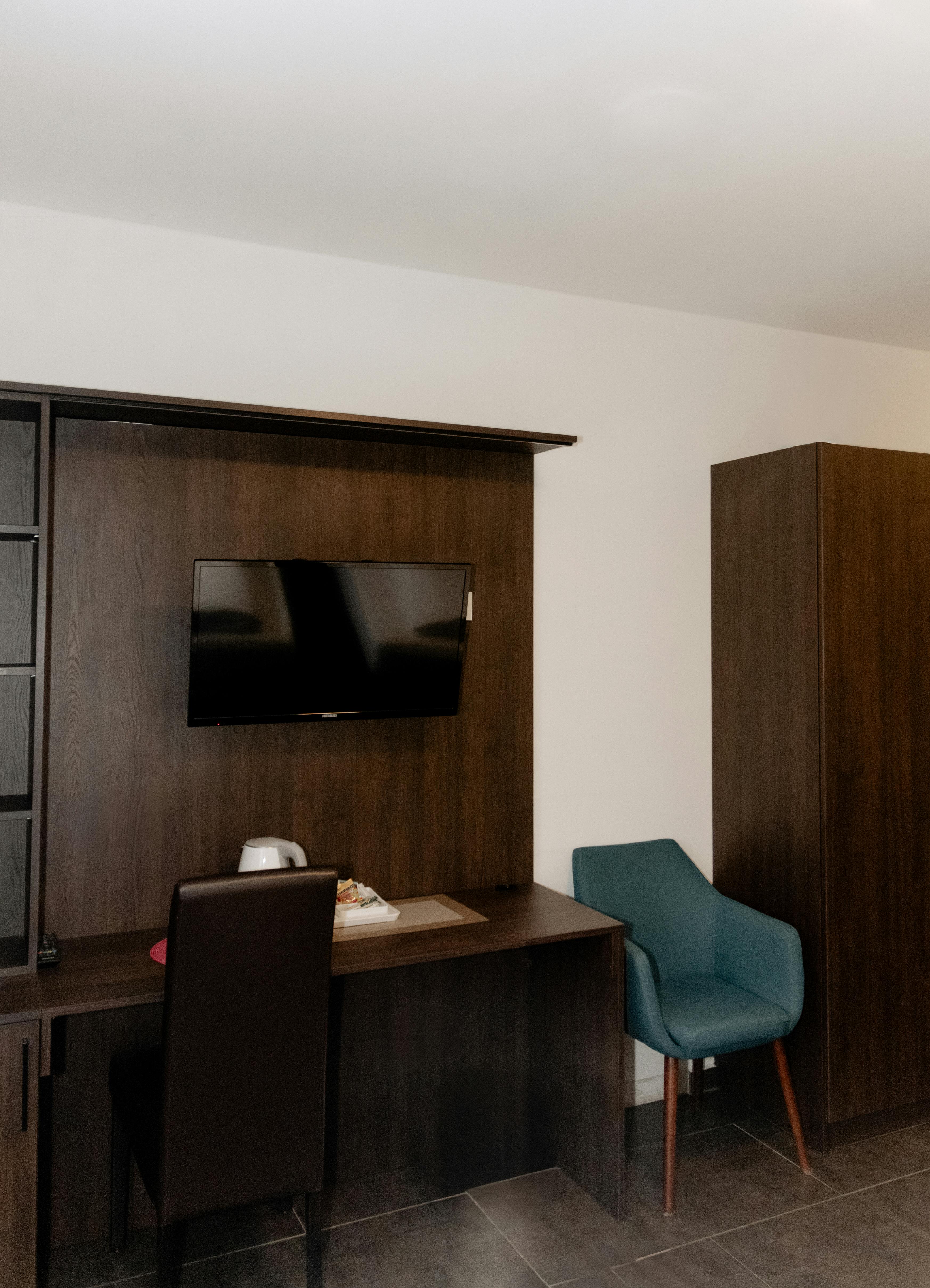 Einzelzimmer mit Arbeitsplatz, TV und Wasserkocher mit Tassen